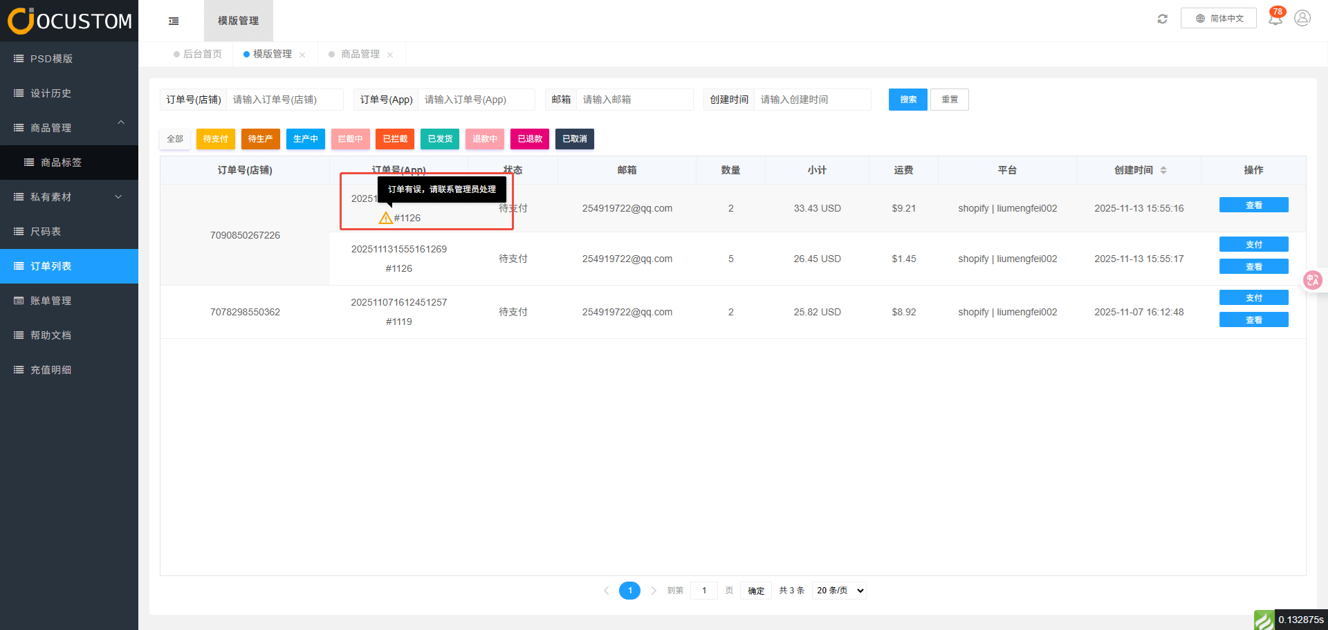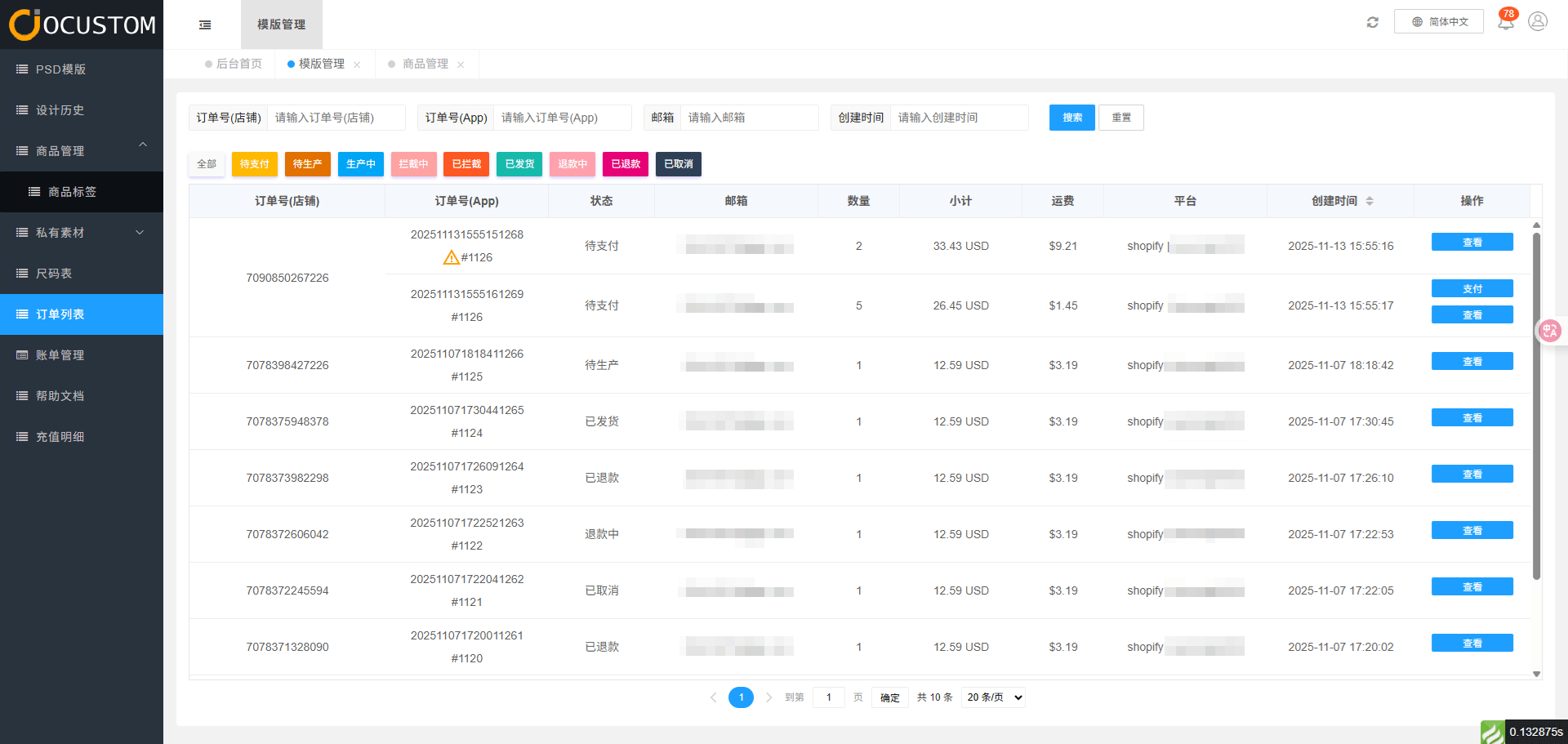 Click the View button to display the order details page, which includes the shipping method, custom product display, total amount, and order status section.