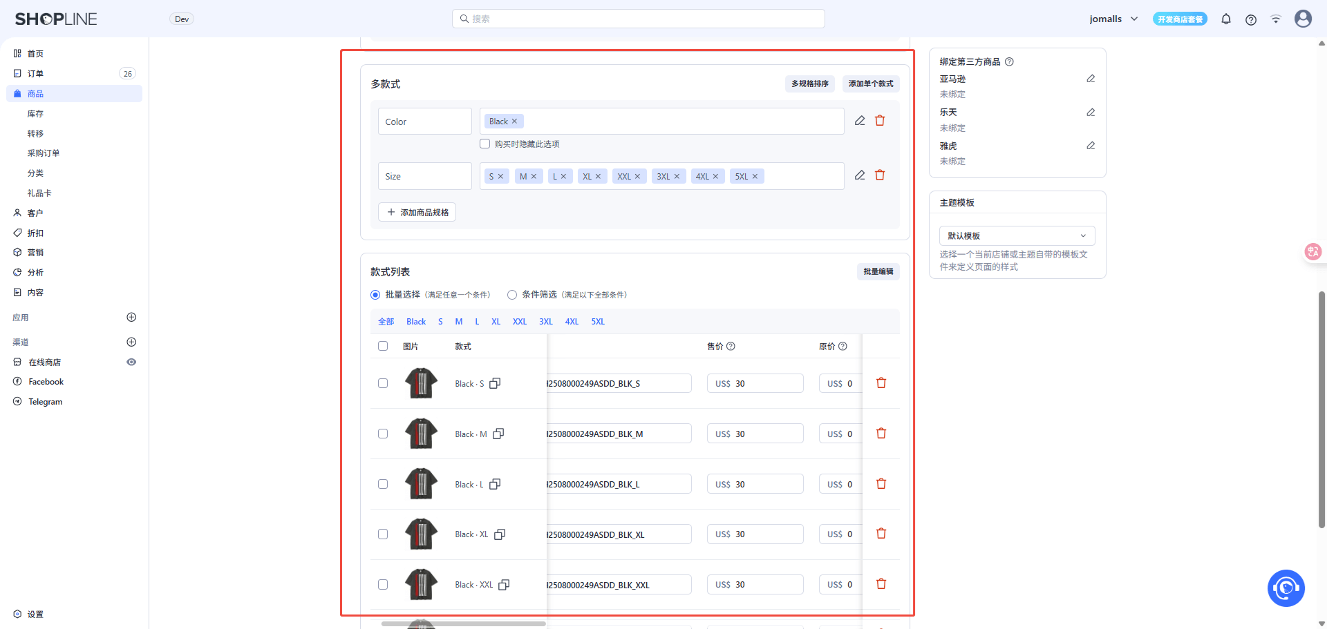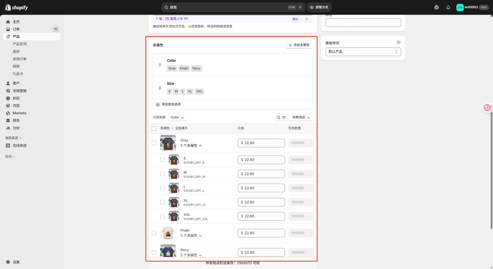 You can click on the color or size above to make bulk modifications to variant products sharing the same attribute.