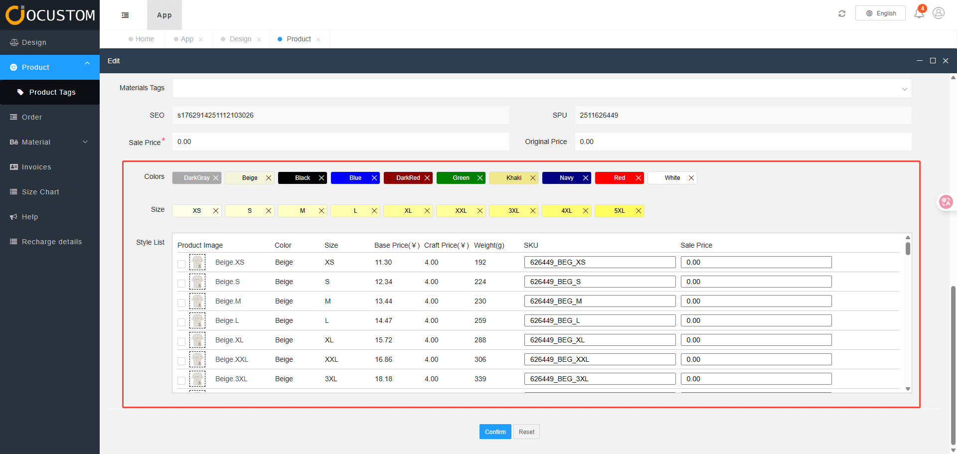 The list displays variant images, attributes such as color and size, along with base garment price, craftsmanship cost, product weight, SKU identifier, and the selling price for each variant.