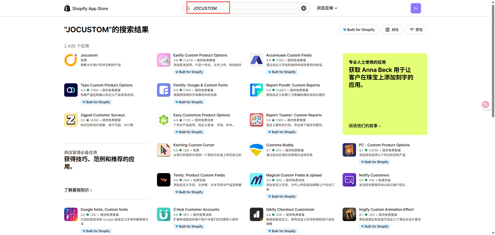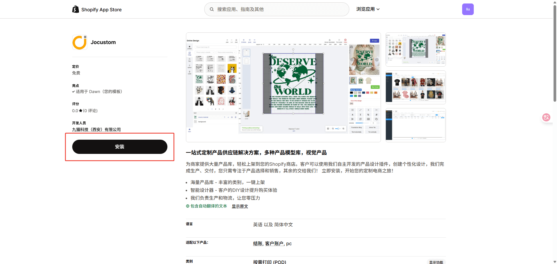This interface provides the complete process for installing the JOCUSTOM app on your Shopify store.